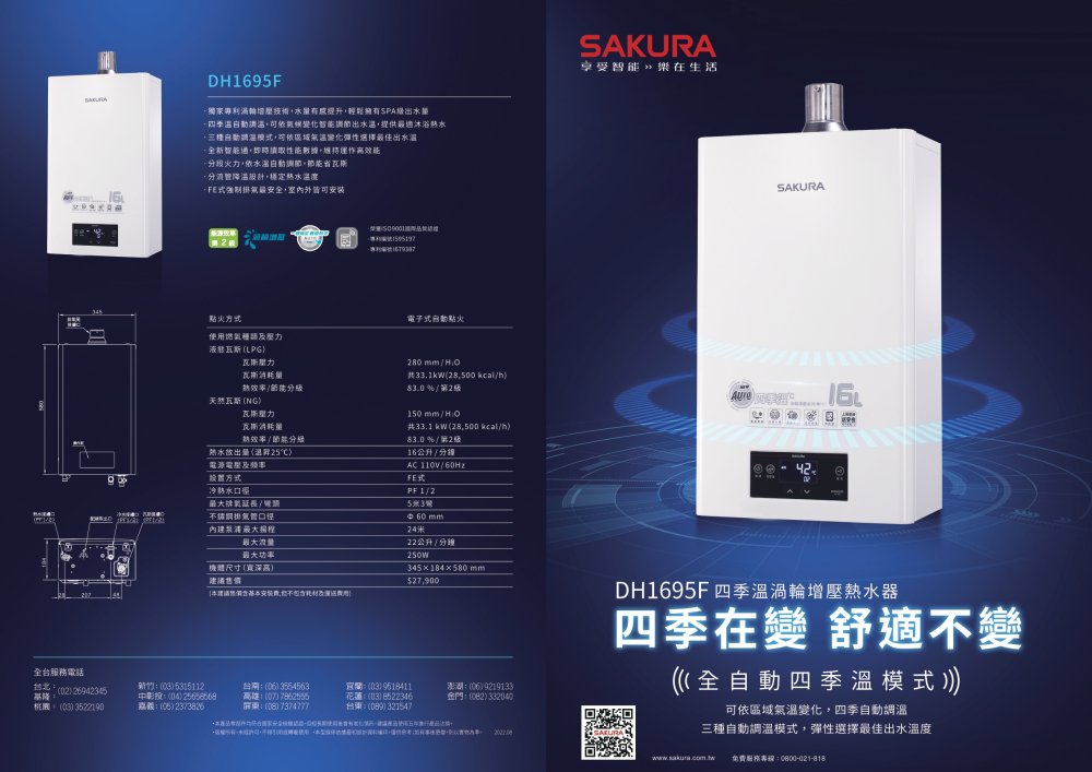 SAKURA 櫻花 DH1695F|四季溫 渦輪增壓|16公升 智能控溫熱水器