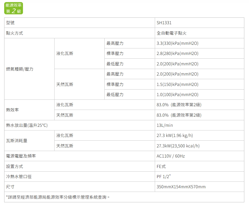 燃氣種類/壓力(天然瓦斯):標準1.5 kPa
